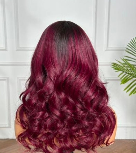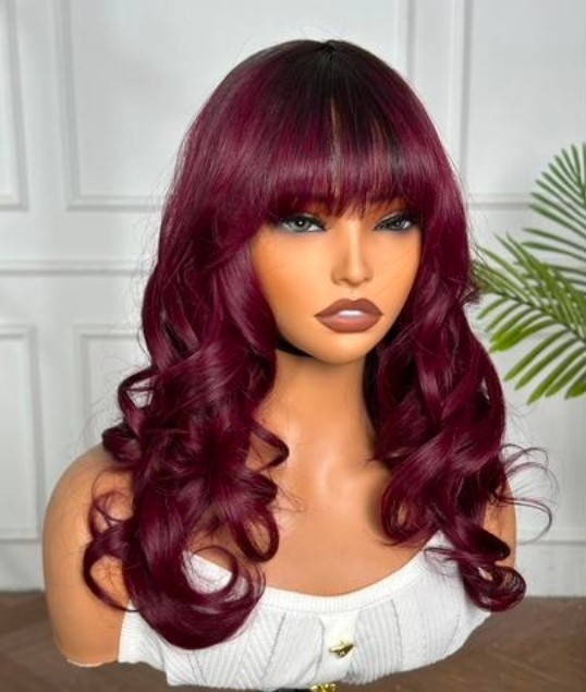 This elegant fringe human hair wig is designed to deliver a flawless, sophisticated look with minimal effort. Crafted from 100% premium human hair, the wig features a rich burgundy/wine color that enhances its luxurious appeal and complements a wide range of skin tones. The full, neatly cut fringe (bangs) frames the face beautifully, while the soft layered curls create natural volume and movement for a glamorous finish.