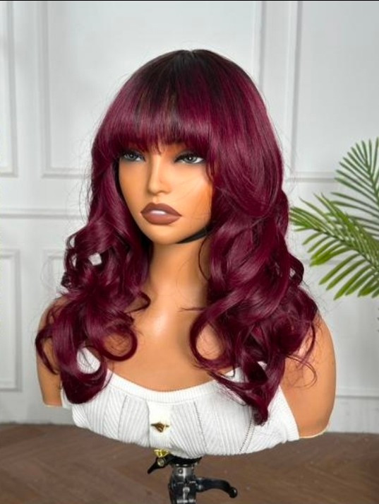 This elegant fringe human hair wig is designed to deliver a flawless, sophisticated look with minimal effort. Crafted from 100% premium human hair, the wig features a rich burgundy/wine color that enhances its luxurious appeal and complements a wide range of skin tones. The full, neatly cut fringe (bangs) frames the face beautifully, while the soft layered curls create natural volume and movement for a glamorous finish.